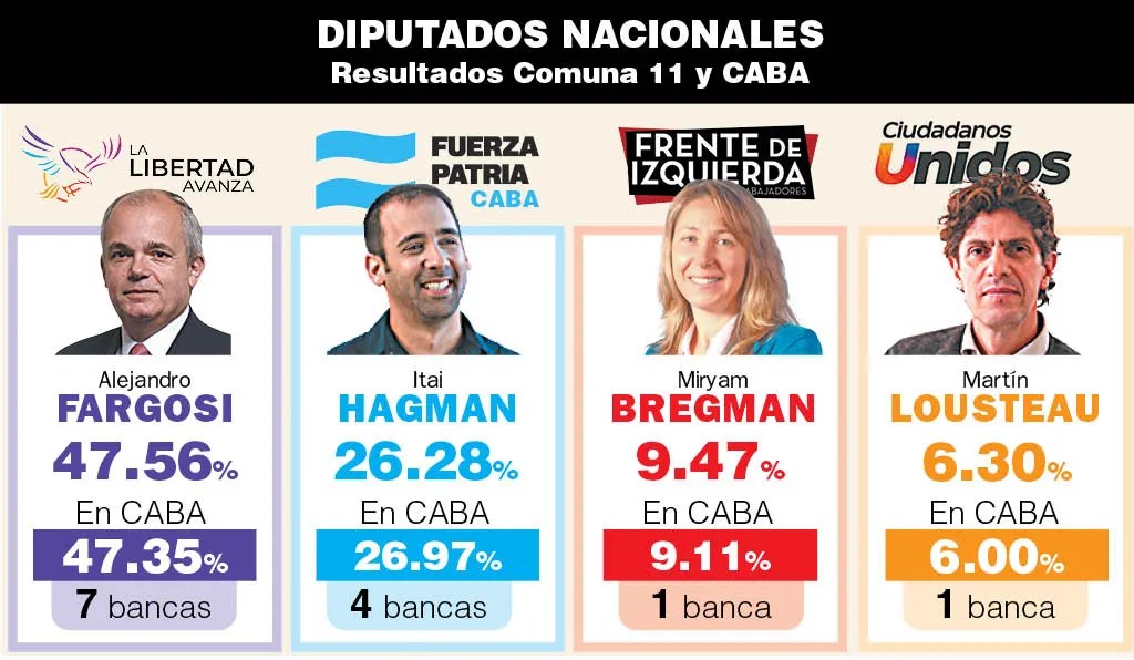 Con un respaldo masivo y contundente, la elección de diputados en la Comuna 11 del 26 de octubre dejó a La Libertad Avanza como la clara ganadora, consolidando su liderazgo en la Comuna 11, aunque con resultados polarizados entre los barrios que la componen. Con más del 50% de los sufragios válidos, superó ampliamente a su principal competidor, Fuerza Patria, y marcó un punto de inflexión en la escena política local que interpela a todos los vecinos.
